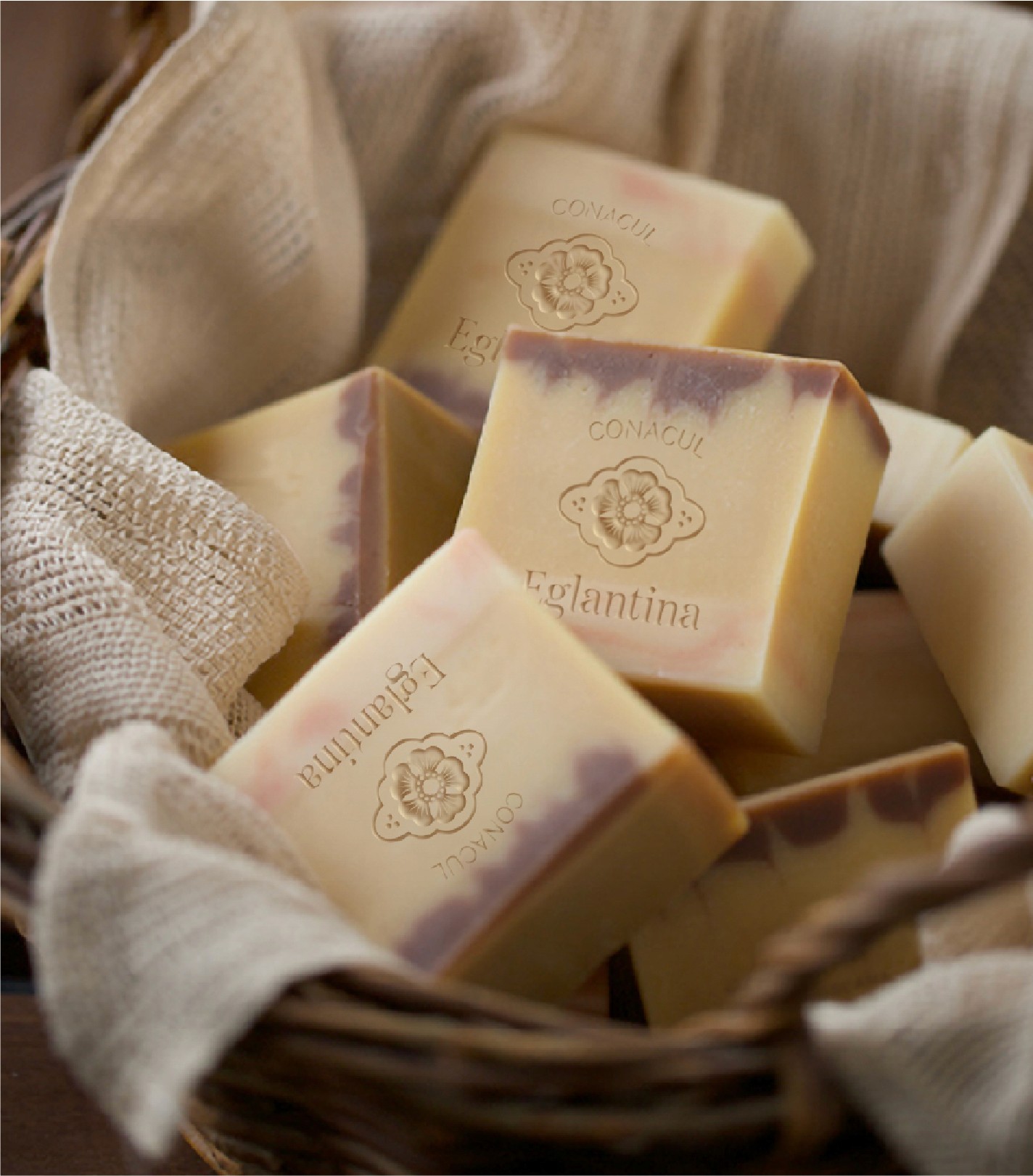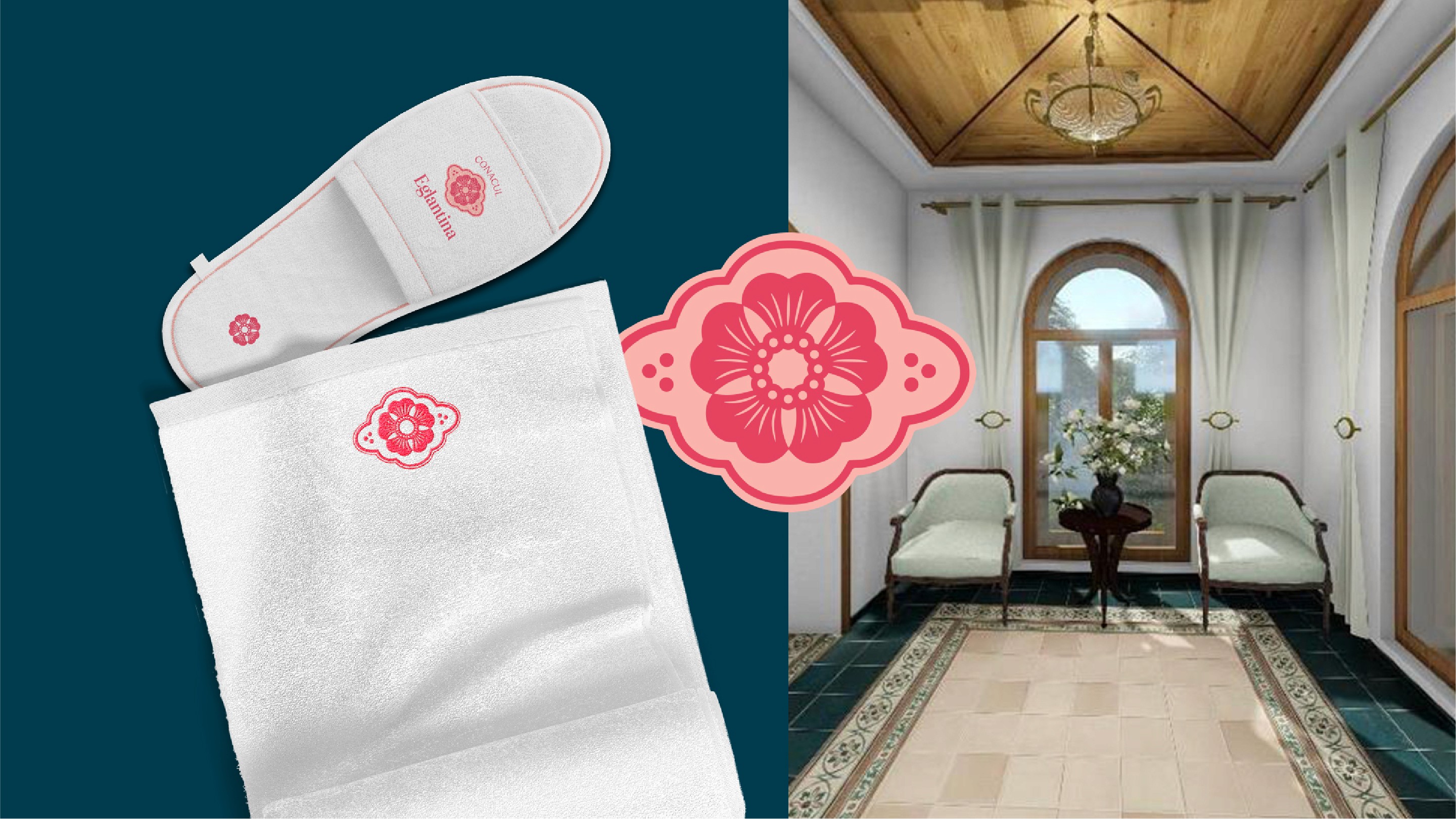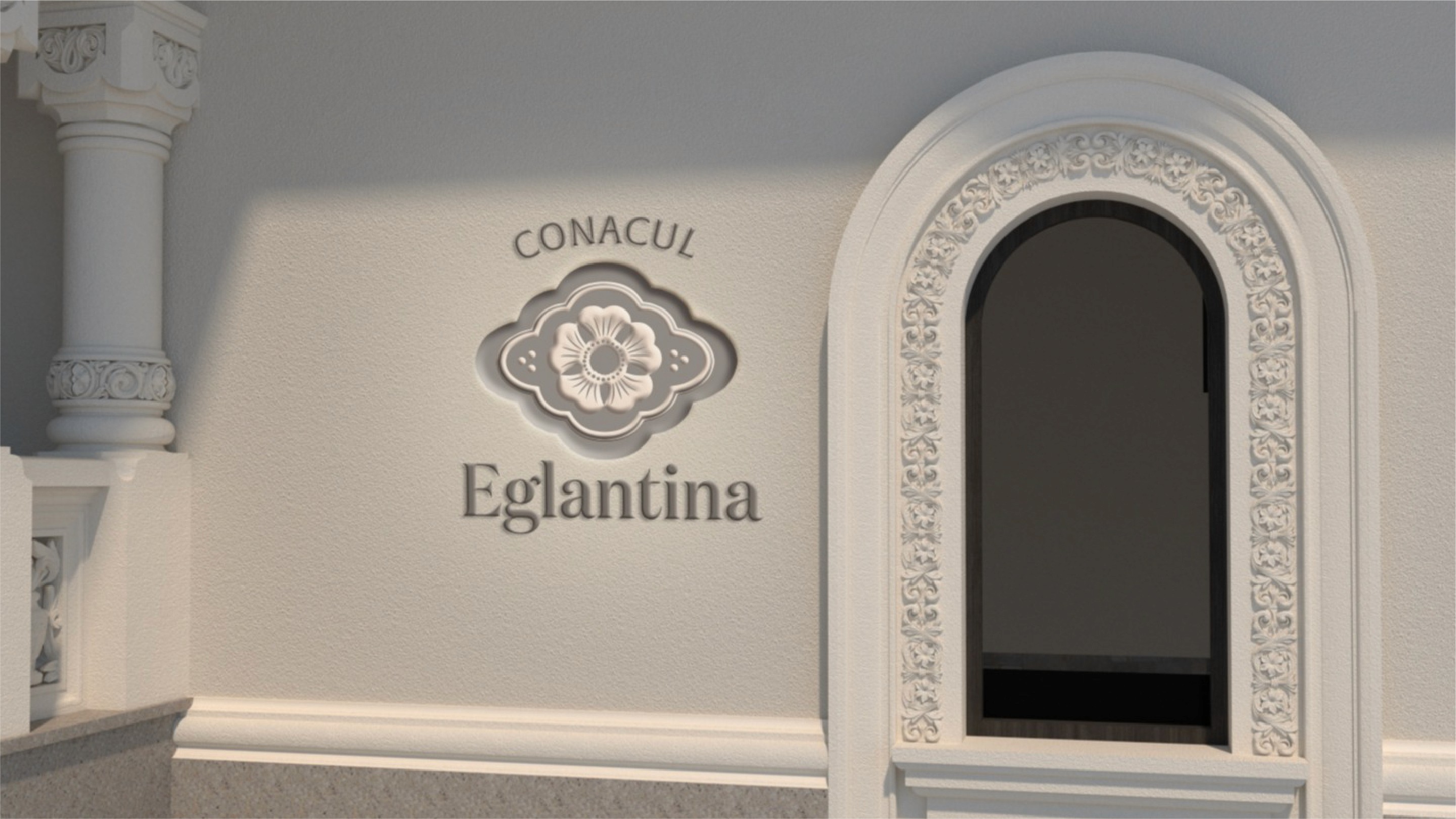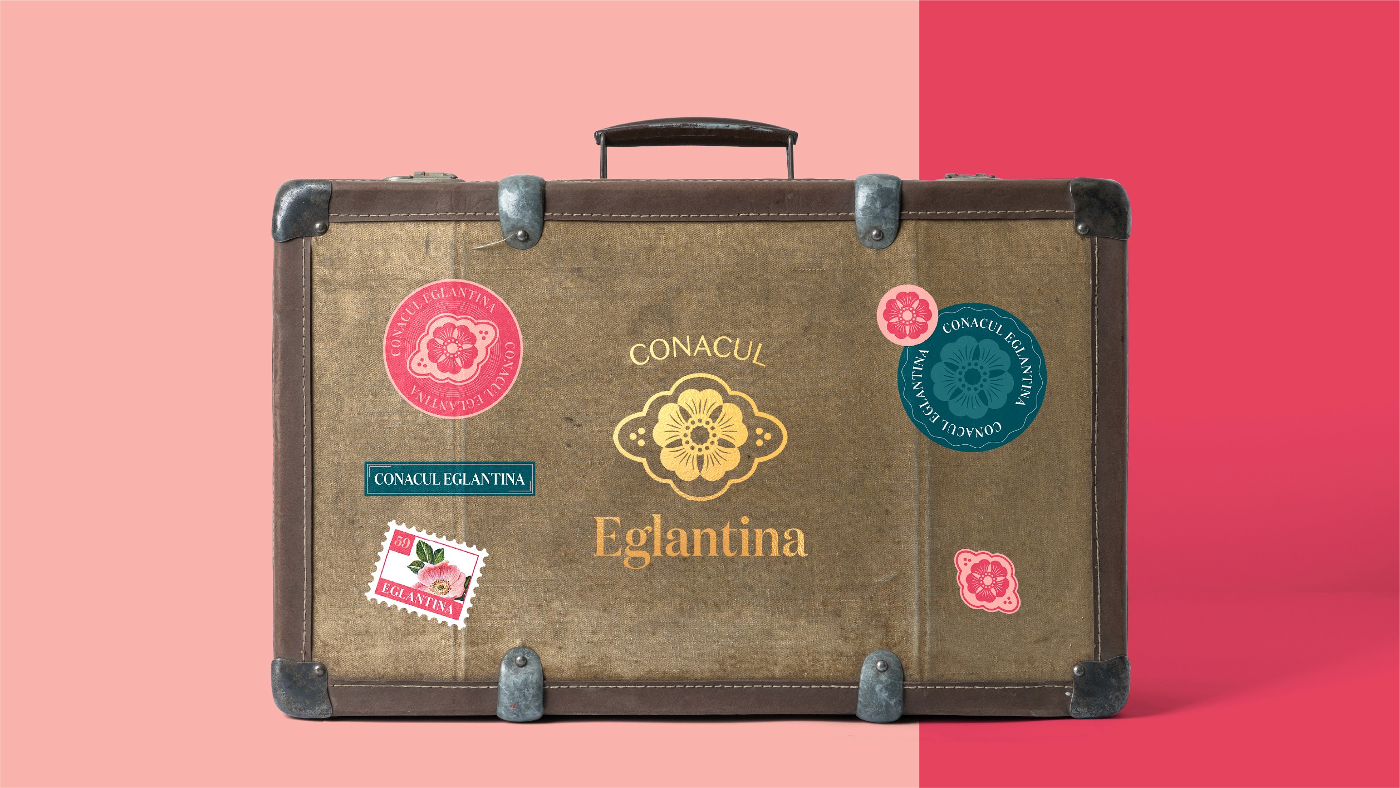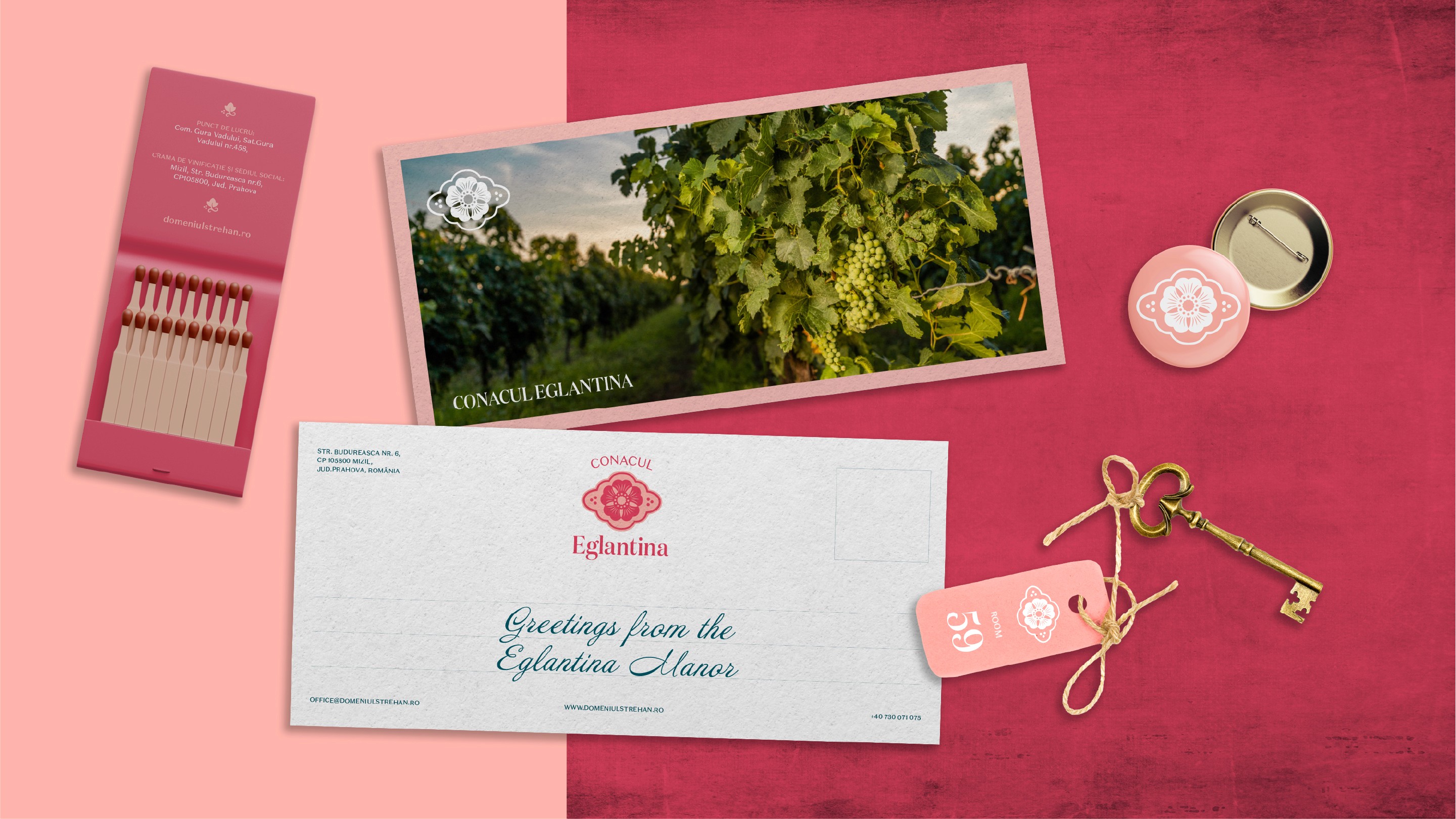 At the heart of the visual identity stands the wild rose — rosa rubiginosa — known in archaic language as eglantine. The flower becomes a symbol of nobility, delicacy and timeless elegance, directly referencing the name and the personality behind the manor. Complementary graphic cues echo the architectural detailing of the interwar period, evoking refinement without ornamentation excess. The logomark also integrates grape motifs — a visual thread connecting Conacul Eglantina to the wider Strehan Estate portfolio — reinforcing coherence within the brand architecture.